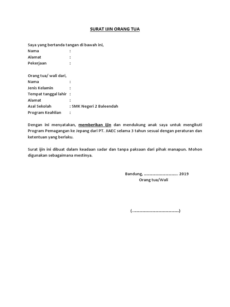 Dapat menjadi bukti dalam membuat suatu surat perjanjian yang dibutuhkan perusahaan atau lembaga untuk kepentingan dinas. Surat izin orang tua untuk mengikuti program pemagangan ke jepang. Renstra kominfo 2014 by wedi mardianto. Contoh power point presentasi pkl jurusan tkj memakai tema facebook slideshare uses cookies to improve functionality and performance and to provide you with relevant advertising. Semoga contoh surat ini dapat melengkapi Feb 02, 2020 · surat persetujuan orang tua berikut ini anda bisa lansung copypaste contoh surat persetujuan orang tua. Jul 09, 2021 · contoh surat pernyataan orang tua memberi izin magang/praktek kerja. Jika contoh surat pengumuman lebih fokus untuk menyampaikan informasi, maka himbaun lebih fokus untuk menyampaikan ajakan ataupun larangan. Dan diwajibkan kita sebagai anak harus bertutur kata yang mulia kepada orang tua. Surat dinas dapat dijadikan sebagai pedoman untuk mengerjakan sesuatu. Aug 11, 2020 · we would like to show you a description here but the site won't allow us. 99, cibinong bogor pekerjaan : Penulisan surat instruksi, pengambilan keputusan, dan surat pemberian izin.